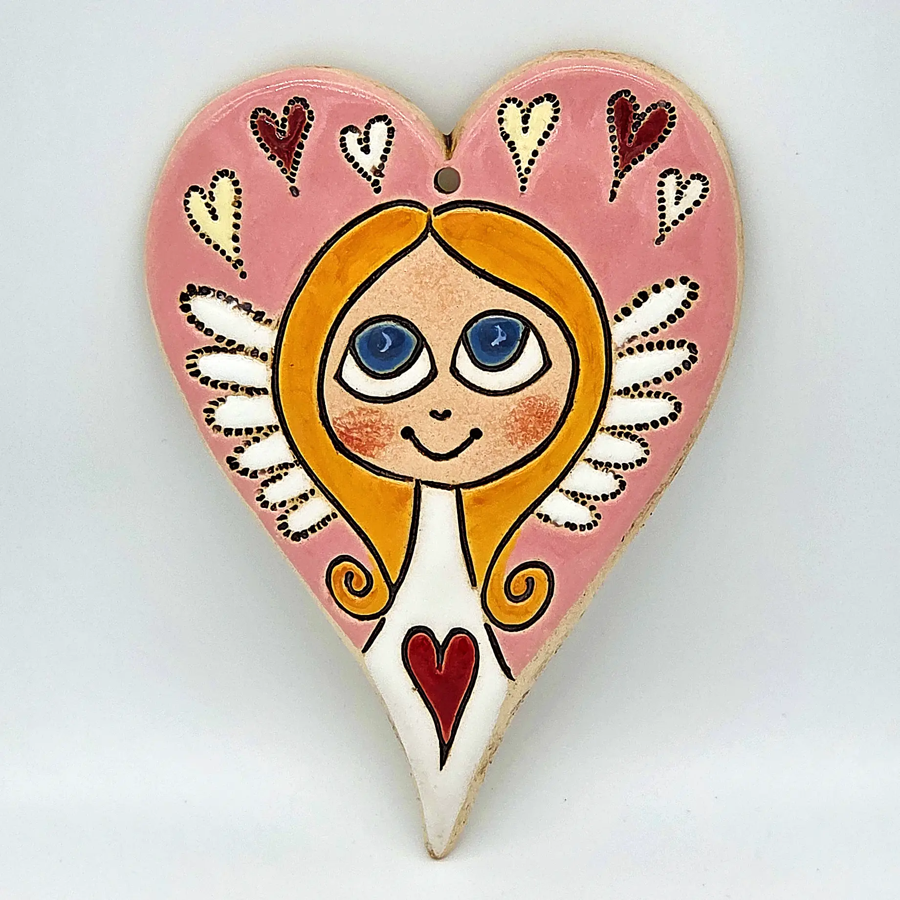 Keramické Srdíčko XL: Ručně malovaná dekorace s duší Hledáte jedinečnou bytovou dekoraci nebo originální dárek od českého autora? Tento keramický obrázek je výsledkem pečlivé ruční práce výtvarnice Helenky Buko Kubíčkové. Každý kus je originál, přímo z dílny české autorky. Tento kousek je ideální pr... celý popis