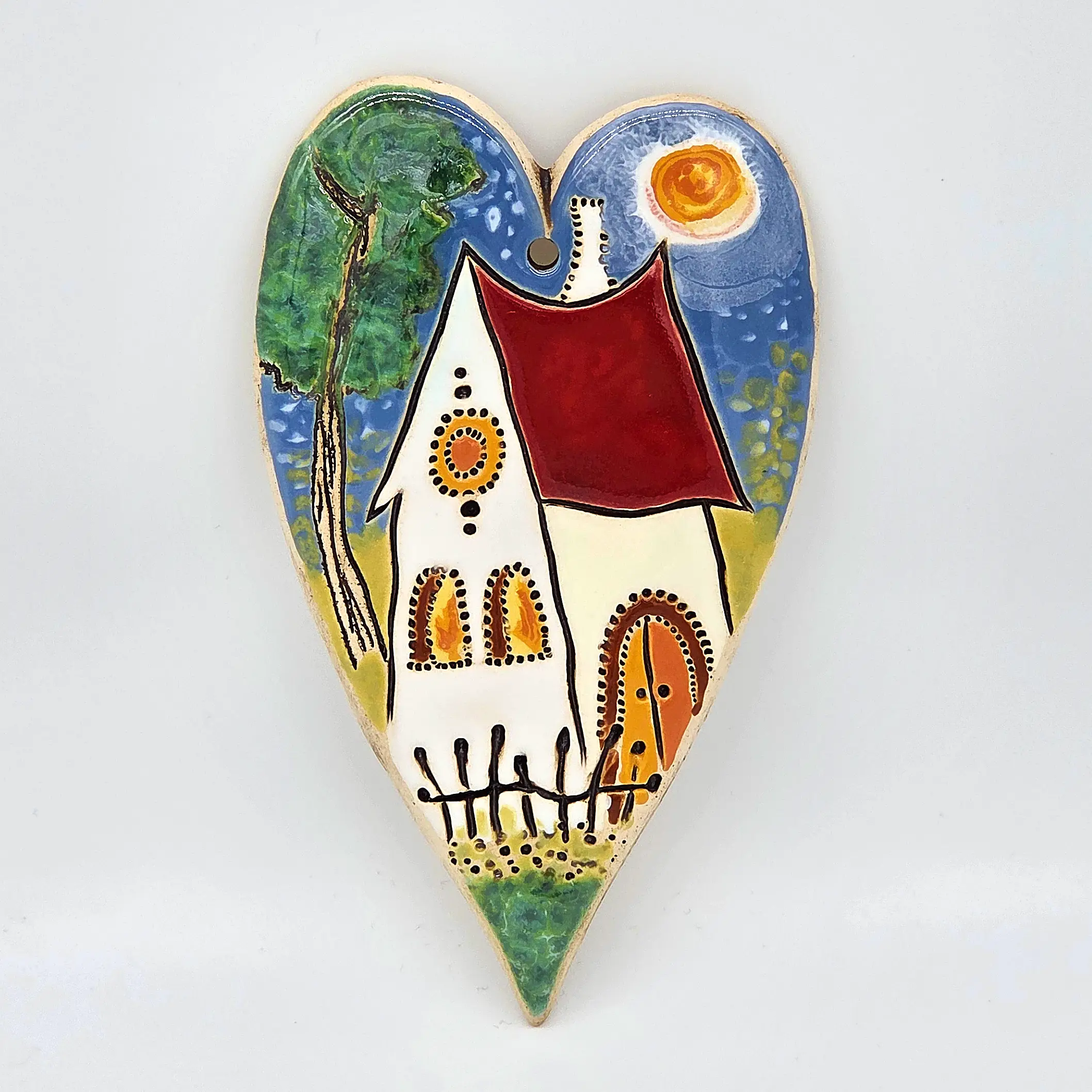 Hledáte jedinečnou bytovou dekoraci nebo originální dárek od českého autora? Tento keramický obrázek je výsledkem pečlivé ruční práce výtvarnice Helenky Buko Kubíčkové. Každý kus je originál, přímo z dílny české autorky. Tento kousek je ideální pro každého, kdo hledá nepřehlédnutelný symbol lásky a domova.