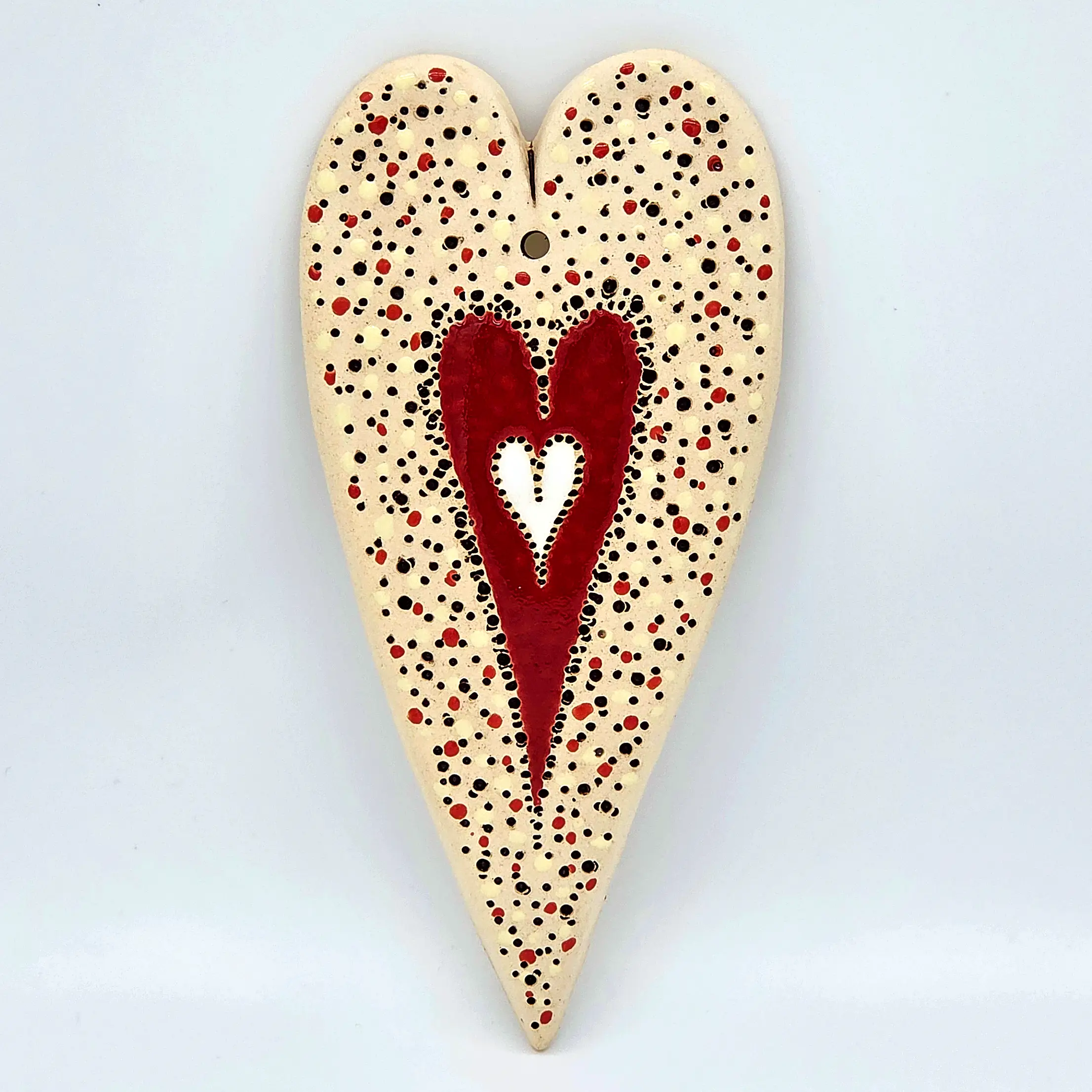 Keramické Srdíčko XL: Ručně malovaná dekorace s duší Hledáte jedinečnou bytovou dekoraci nebo originální dárek od českého autora? Tento keramický obrázek je výsledkem pečlivé ruční práce výtvarnice Helenky Buko Kubíčkové. Každý kus je originál, přímo z dílny české autorky. Tento kousek je ideální pr... celý popis