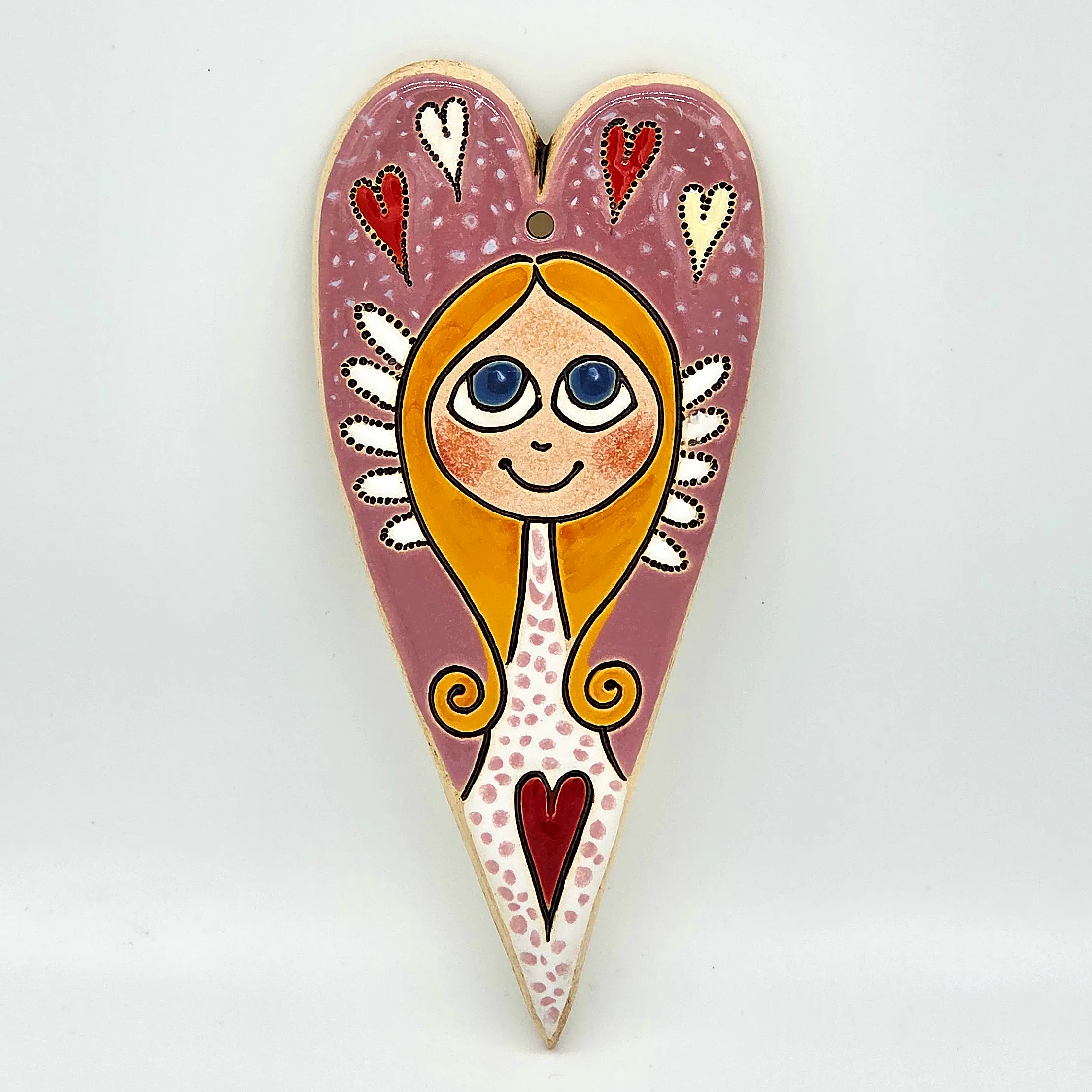 Hledáte jedinečnou bytovou dekoraci nebo originální dárek od českého autora? Tento keramický obrázek je výsledkem pečlivé ruční práce výtvarnice Helenky Buko Kubíčkové. Každý kus je originál, přímo z dílny české autorky. Tento kousek je ideální pro každého, kdo hledá nepřehlédnutelný symbol lásky a domova.
