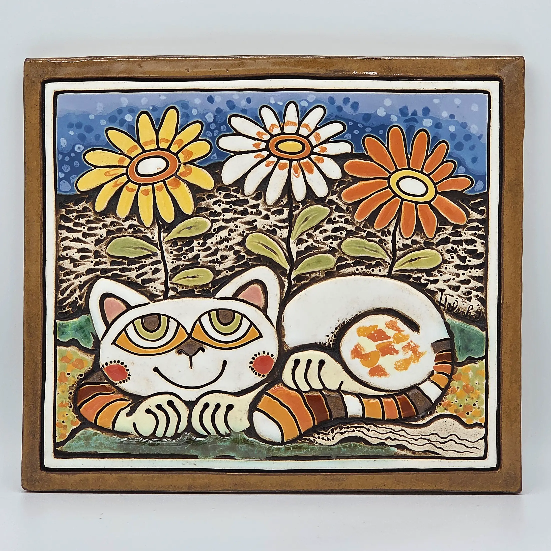 Keramický obrázek - Kočka a kopretiny